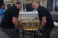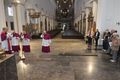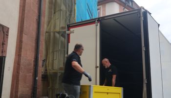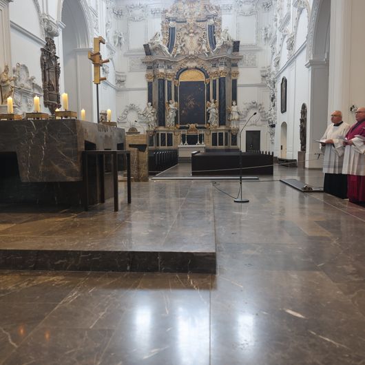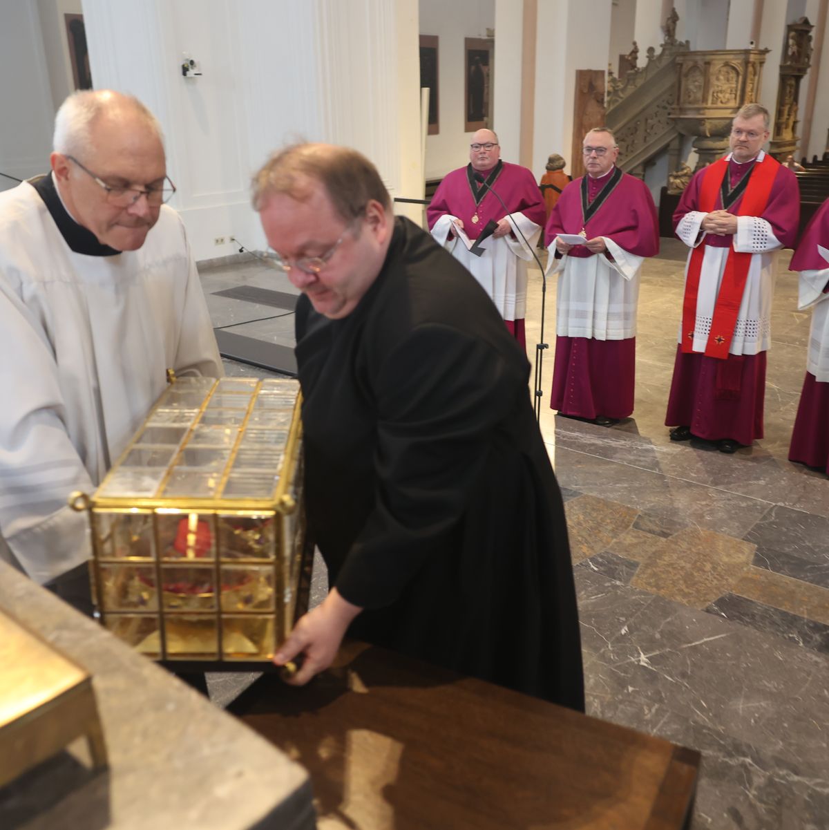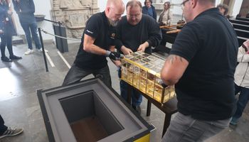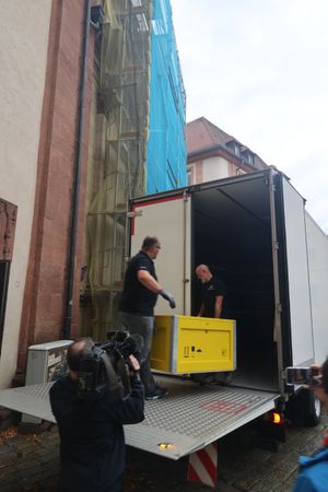 Würzburg (POW) Die Häupter der Frankenapostel sind schon vorausgereist: Am Donnerstag, 26. September, sind bei einer liturgischen Feier die Reliquien aus dem Altar des Kiliansdoms genommen und im Anschluss für den Transport via Lkw in Richtung Irland verladen worden. Insgesamt über 100 Gläubige aus dem Bistum sind von Mittwoch, 2., bis Sonntag, 6. Oktober, mit Bischof Dr. Franz Jung und Generalvikar Dr. Jürgen Vorndran auf Pilgerreise in der irischen Heimat Kilians, Kolonats und Totnans. Der Kiliansschrein wurde für die Irlandreise in einer speziellen Klimakiste verpackt und wird von einer Fach-Kunstspedition auf die grüne Insel gebracht. Vor Ort übernehmen die irischen Gastgeber die Reliquien und betreuen sie während der gesamten Reise. Wie während der Kiliani-Wallfahrtswoche bleibt der Altar des Doms an dieser Stelle leer. Es sind jedoch weitere Reliquien dort fest eingelassen.