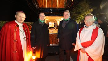 Dann naht das von Polizeiautos eskortierte Transportfahrzeug mit dem Reliquienschrein der Frankenapostel mit dem Nummernschild „Kilian 2024“. Deutsche und Iren tragen die Häupter in die Mitte der auf dem Gelände an der Quelle versammelten Gläubigen. Der Chor der örtlichen Pfarrei singt irische Weisen. Father Paul Prior, Pfarrer von Mullagh, besprengt die Reliquien mit Weihwasser. Auf der abgesperrten Straße setzt sich die Prozession in Richtung Mullagh in Bewegung. Zur Linken ist in der Ferne ein großes Feuer auf dem Berg von Mullagh zu sehen. Sphärischer irischsprachiger Gesang und der tiefe Klang von Hörnern schallen aus großen Lautsprechern beim Feuer herunter und umgeben den stillen Zug mit einer besonderen Stimmung. „Wir haben diesen Abend so lange herbeigesehnt“, raunt der Ortspfarrer seinem Nebenmann zu.
