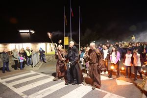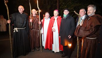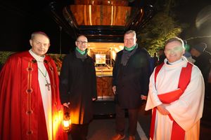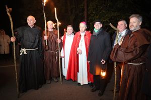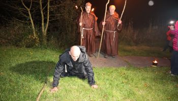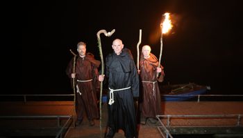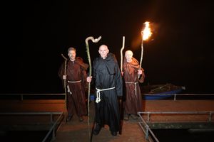 Am See setzen sich die drei Mönche an die Spitze der Gruppe. „Auf zur Kirche“, ruft der Mönch mit dem Bischofsstab. Die Jungen Herren der Würzburger Domsingknaben unter der Leitung von Domkapellmeister Alexander Rüth sorgen unter anderem mit dem irischen Halleluja für die musikalische Umrahmung. Alle paar Meter entfernt stehen links und rechts der Straße Frauen und Männer mit Fackeln und beleuchten so den Weg durch die Nacht. Insgesamt knapp drei Kilometer zieht die Prozession vom Ausgangspunkt zum Ziel. In der Kilianskirche von Mullagh wird der Schrein der Märtyrer aus dem Tragegestell genommen und vor dem Altar aufgestellt.