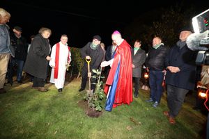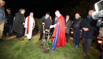 Knapp eine halbe Stunde zuvor haben sich etwa einen Kilometer vom See entfernt an diesem Donnerstagabend, 3. Oktober, die Würzburger Pilgergruppe und zahlreiche Irinnen und Iren an der von mobilen Scheinwerfern hell erleuchteten Sankt Kiliansquelle versammelt. Nicht nur wegen der Verbindung mit dem Frankenapostel ist die äußerlich unscheinbare Wasserstelle ein wichtiger Ort. Sie war auch für die Katholiken der Gegend ein wichtiger Versammlungsort, als während der englischen Besatzung jede öffentliche Ausübung des katholischen Glaubens untersagt war. Es erklingen das Kilianslied „Wir rufen an den teuren Mann“ und das von einem Iren verfasste Kiliansgebet. Darin heißt es: „Der See, der Hügel, und die Quelle in Mullagh, die Du geliebt und doch verlassen hast, erinnern uns bis heute an Deine mutige Pilgerschaft für Christus. Mögen Deine verbindende Reise und Dein heldenhaftes Martyrium uns im Geist erfüllen und tragen.“ Als Zeichen der Verbundenheit zwischen Deutschland und Irland pflanzen die Bischöfe Martin Hayes und Dr. Franz Jung einen jungen Eichenbaum, gezogen aus einem Samen aus Kürnach.