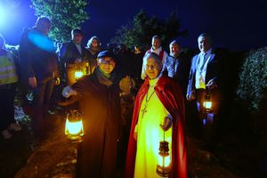 Bischof Jung greift den Ball auf und betont in seiner englischsprachigen Ansprache: „Wir alle haben diesen emotionalen Moment lange herbeigesehnt.“ Diese Nacht sei eine besondere Gelegenheit, den Märtyrern für die besondere Gemeinschaft zu danken, die sie geschenkt hätten. „Es ist die Gemeinschaft in Christus, die sie in Wort und Tat verkündet und mit ihrem Blut besiegelt haben.“ Die Schutzpatrone Kilian, Kolonat und Totnan brächten nicht nur an diesem Abend Menschen unterschiedlicher Nation, Kultur und sozialer Stellung zusammen. „Wir versammeln uns an See, Berg und Quelle, die sie so sehr geliebt haben. Möge dieses Gedenken unsere Liebe zu Christus stärken und uns zu gläubigen und treuen Missionaren seiner frohen Botschaft machen.“ Noch einmal erklingt das Kilianslied, diesmal vom Pfarreichor im Wechsel in irischer und deutscher Sprache gesungen. Als Zeichen der Verbundenheit von Franken und Iren entzünden die beiden Bischöfe eine Kerze, auf der die Frankenapostel in einem Boot abgebildet sind.