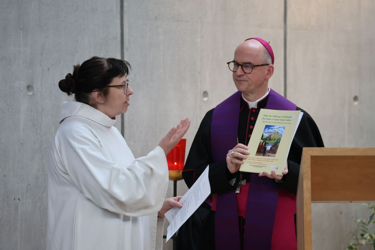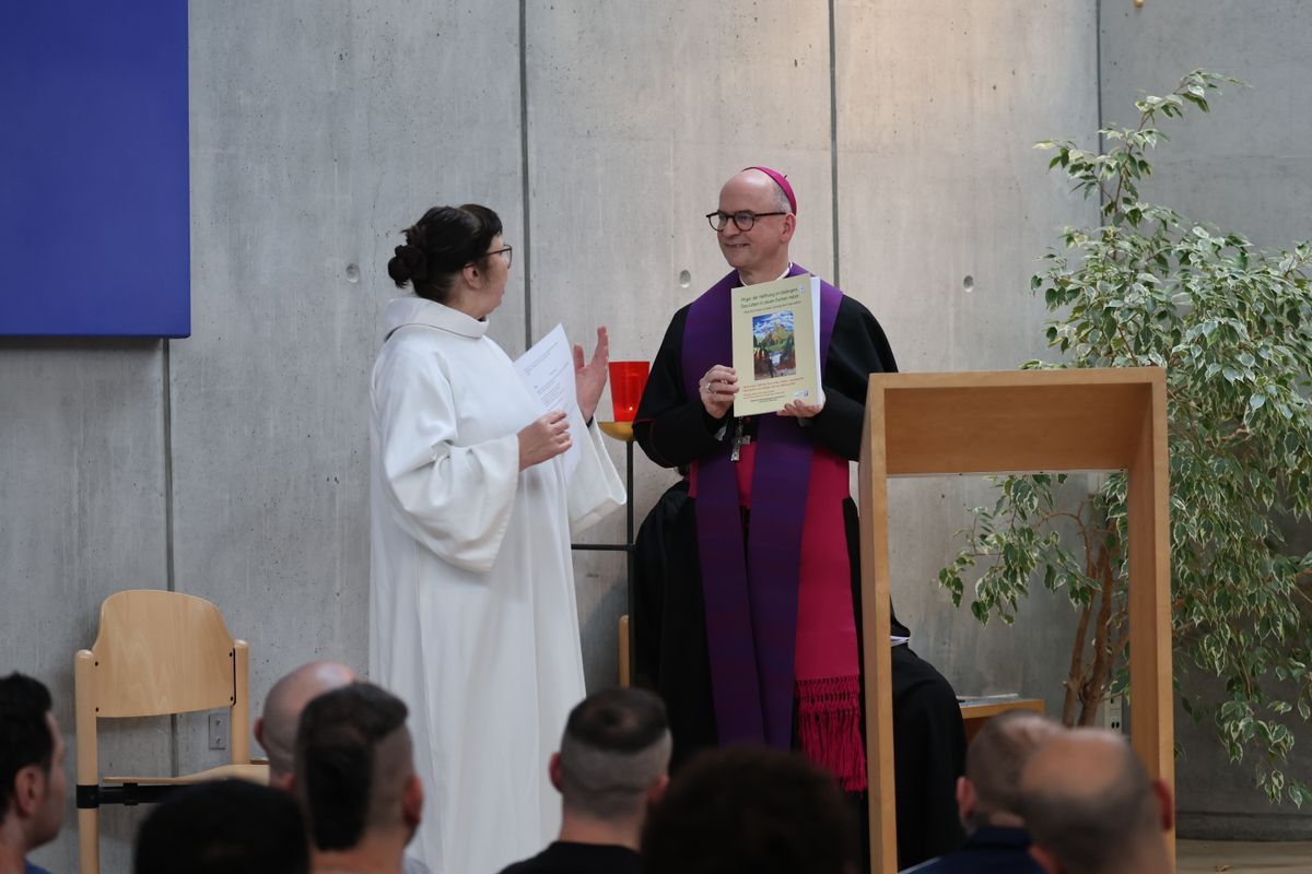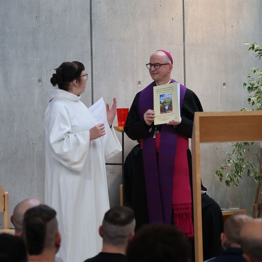 Bevor nach dem Segen „Stille Nacht“ erklingt, dankt Gefängisseelsorgerin Schäfer dem Bischof, der die ermutigende Botschaft der Weihnacht zum Abschluss des Heiligen Jahres den Gefangenen nahegebracht habe. Als Ausdruck des Danks überreicht sie ihm ein Buch mit Gedanken, Gebeten und Liedern von Gefangenen aus ganz Deutschland. Es ist zum „Jahr der Hoffnung“ als Gemeinschaftsprojekt der deutschen Gefängnisseelsorge enstanden. Das Original hat sie vor wenigen Tagen bei einer Generalaudienz in Rom gemeinsam mit Weihbischof em. Ulrich Boom dem Papst überreicht.