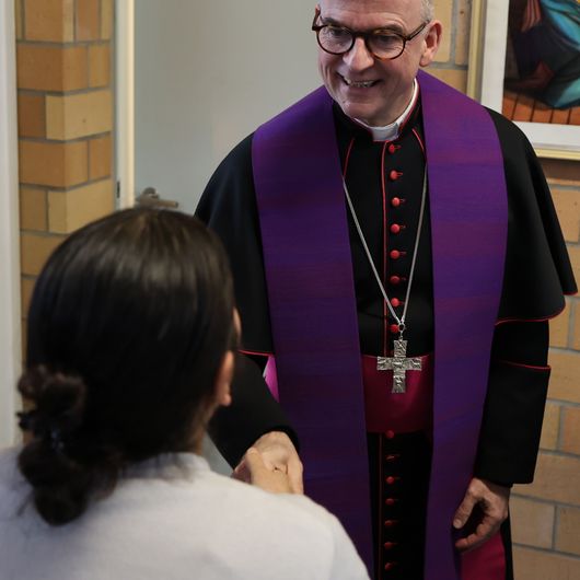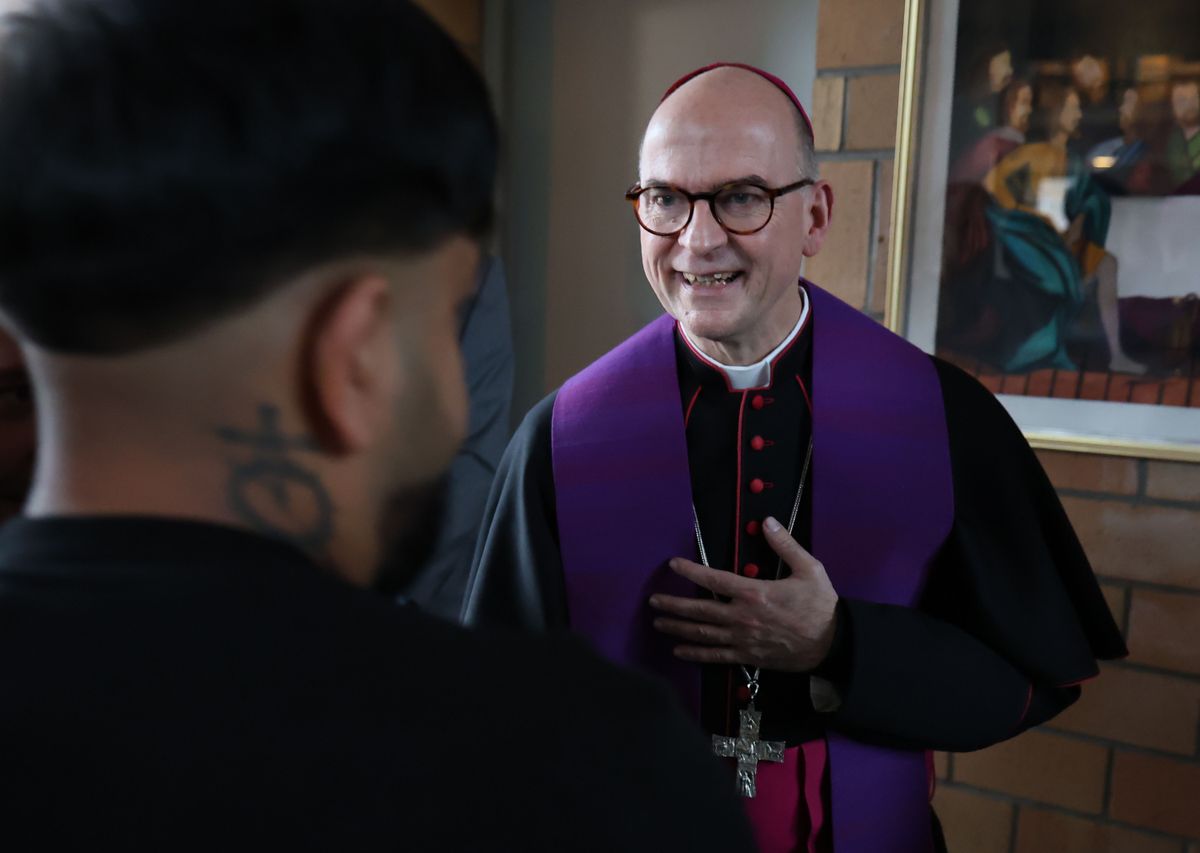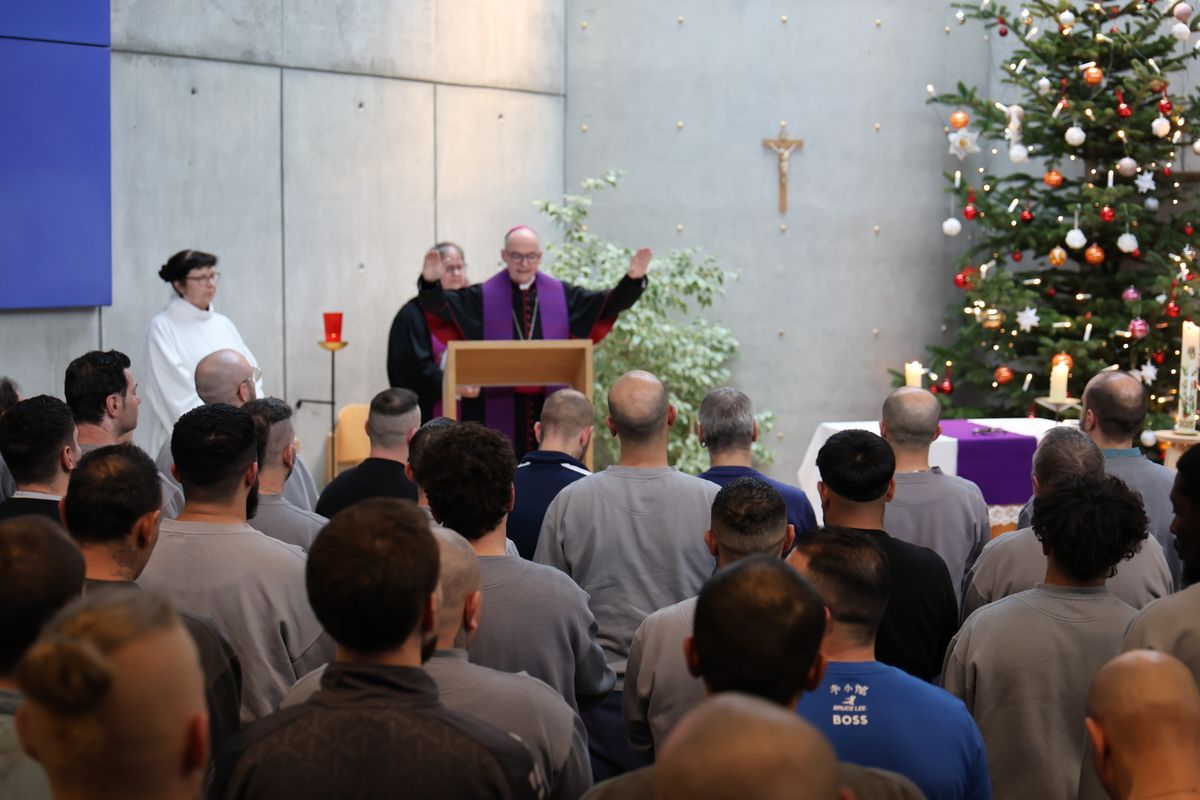 In seiner Predigt nach dem Weihnachtsevangelium spricht Bischof Jung über das „Friedensangebot Gottes an uns Menschen“. Ausgangspunkt seiner Predigt ist das Adventslied „O Heiland, reiß die Himmel auf“. Darin heißt es unter anderem: „Reiß ab vom Himmel Tor und Tür, reiß ab, wo Schloss und Riegel für.“ Der Bischof schlägt einen Bogen zwischen den verschlossenen Gefängnistüren und den inneren Schlössern des Lebens – Schuld, Angst und Verzweiflung. Weihnachten, sagt der Bischof, sei das Zeichen, dass Gott selbst die Himmelstür öffne und Frieden anbiete. Jesus komme besonders zu denen, die sich eingeschlossen fühlen. Mit ihm könne Versöhnung beginnen – mit sich selbst, mit anderen und mit Gott.