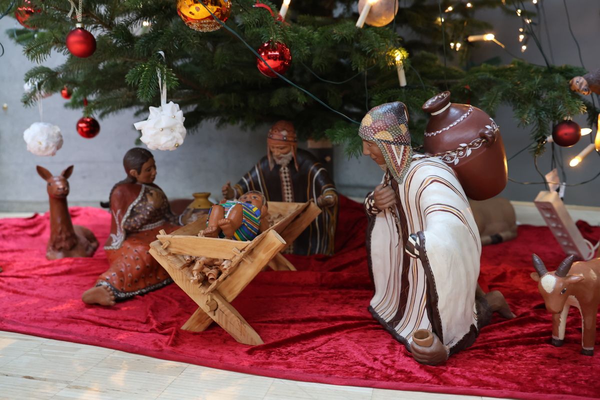 Zu Beginn des Weihnachtsgottesdienstes am Tag vor Heiligabend begrüßt Schäfer alle, die zum Gottesdienst in die JVA-Kapelle gekommen sind, besonders Bischof Jung. Zwei Vertreter der Deutschen Pfadfinderschaft Sankt Georg (DPSG) und Pfadfinderinnenschaft Sankt Georg (PSG) aus Würzburg-Lengfeld bringen das Friedenslicht von Betlehem an die Krippe.