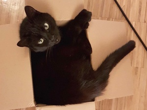 Aber dieser Karton auf dem Bild ist definitiv zu klein. Ihr vorwurfsvoller Blick sagt: Was habt ihr mir da hingestellt? Zu eng und unbequem!