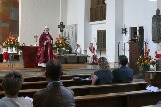 „Die Tiefe heißt, den Abgrund der eigenen Ohnmacht im Leben ermessen und das Kreuz Christi im eigenen Leben erfahren.“ Märtyrer wie die Frankenapostel hätten gezeigt, was das bedeuten könne. Die Länge schließlich deutete der Bischof als die Dimension der Zeit. Wer keine Gewalt anwende, so wie es die Bergpredigt fordere, der bringe den langen Atem mit, der für alle Veränderungen notwendig sei. Gewalt sei immer ein Ausdruck von Resignation und Hoffnungslosigkeit, wenn der Glaube fehle, die Dinge auf einem guten Weg regeln zu können. „Wir brauchen den langen Atem des Geistes Gottes für alle Veränderungen“, erklärte der Bischof. Am Ende wies er auf den Engel hin, der in der Offenbarung des Johannes mit einem goldenen Messstab die heilige Stadt Jerusalem neu vermessen soll. Der Bischof verband damit den Wunsch für die Kirche und alle Gläubigen, dass dieser heilige Engel dabei helfe, über das eigene enge Maß hinauszukommen, um die Liebe Christi zu erkennen, die jedes Maß übersteige.