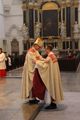 Bei der Anrufung der Heiligen lag der Weihekandidat ausgestreckt am Boden und zeigte seine Bereitschaft, sich Gott ganz hinzugeben. Dann legten ihm Bischof Jung, Bischof em. Dr. Friedhelm Hofmann, Weihbischof Ulrich Boom sowie rund 30 Priester aus der ganzen Diözese Würzburg die Hände auf – seit urchristlicher Zeit Zeichen für die Beauftragung und Bevollmächtigung. Im Weihegebet bat Bischof Jung schließlich um den Geist Gottes für den Neupriester. Als „ausdeutende Zeichen“ der Weihehandlungen zog Dekan Stefan Gessner, Leiter der Pfarreiengemeinschaft „Sankt Christophorus im Baunach-, Itz- und Lautergrund, Baunach“, dem Geweihten das priesterliche Gewand an, salbte ihm Bischof Jung die Hände, überreichte Kelch und Hostienschale und umarmte ihn zum Friedensgruß.