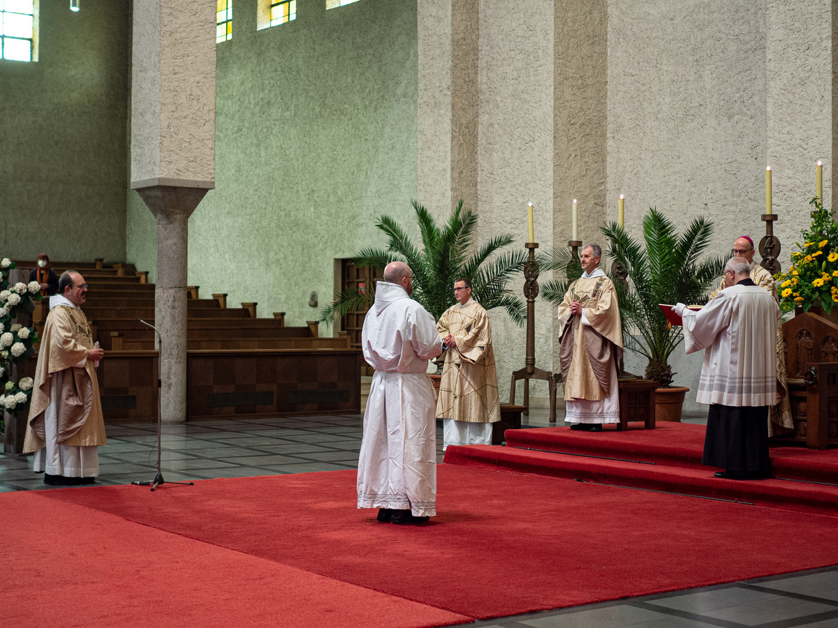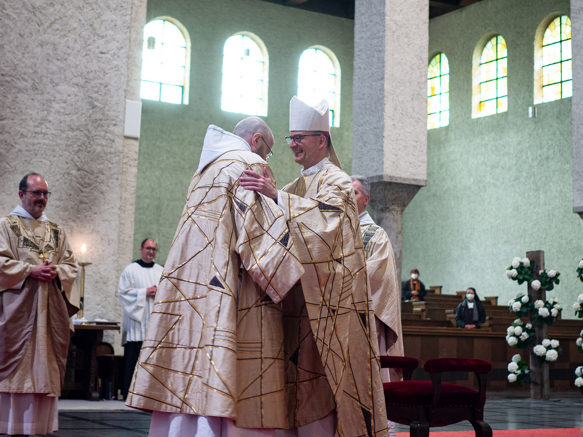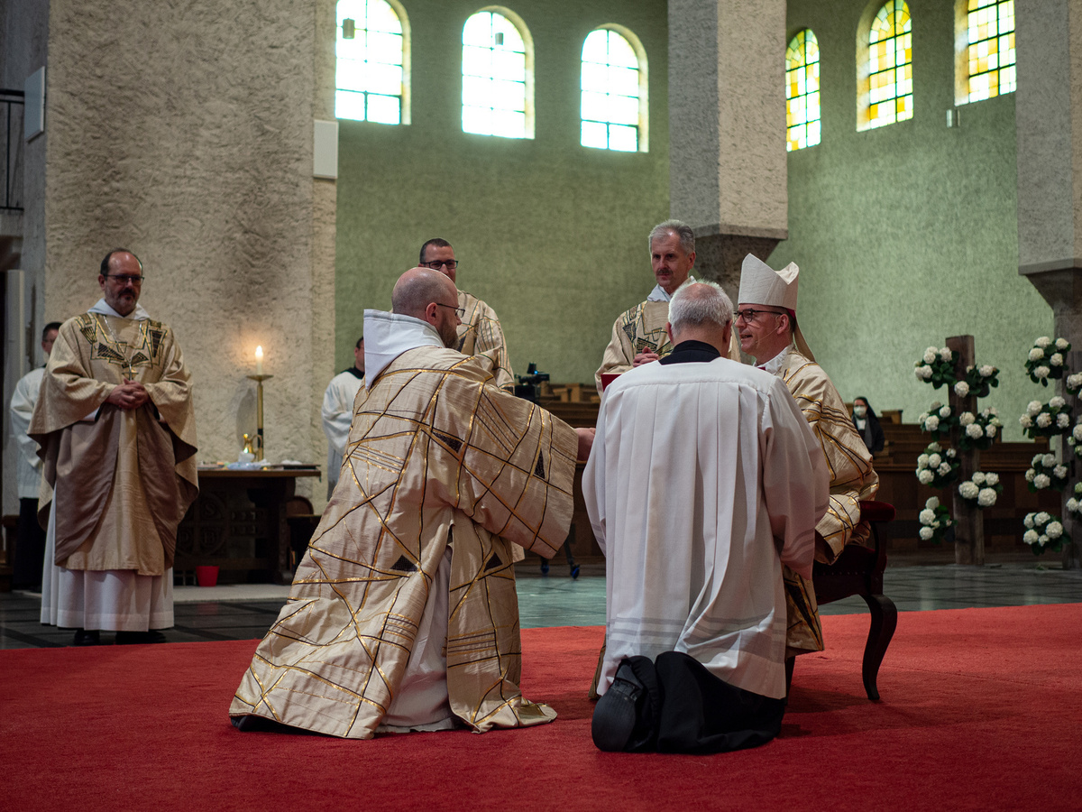In der Predigt stellte Bischof Jung die Lesungen des Hochfests mit Versen aus der Benediktsregel und Gedanken zum Dienst des Diakons in Beziehung. Christus, erklärte er, verlasse an Himmelfahrt nicht die Kirche. „Christus geht uns voraus zum Vater.“ Sein Gott solle auch der Gott der Menschen werden. Die Mönche versprechen in ihrer Profess die „Conversatio morum“, bei der es jeden Tag aufs Neue darum gehe, das Herz zum Herrn zu erheben. Der Diakon habe durch sein Amt den Auftrag, diese Conversatio nicht nur vorzuleben, sondern durch seinen Dienst zu fördern.