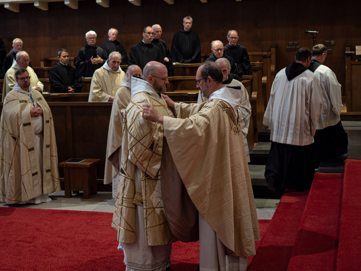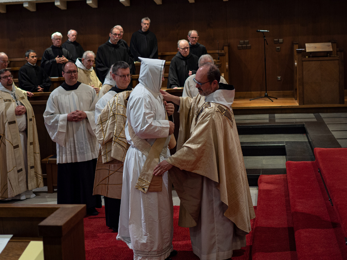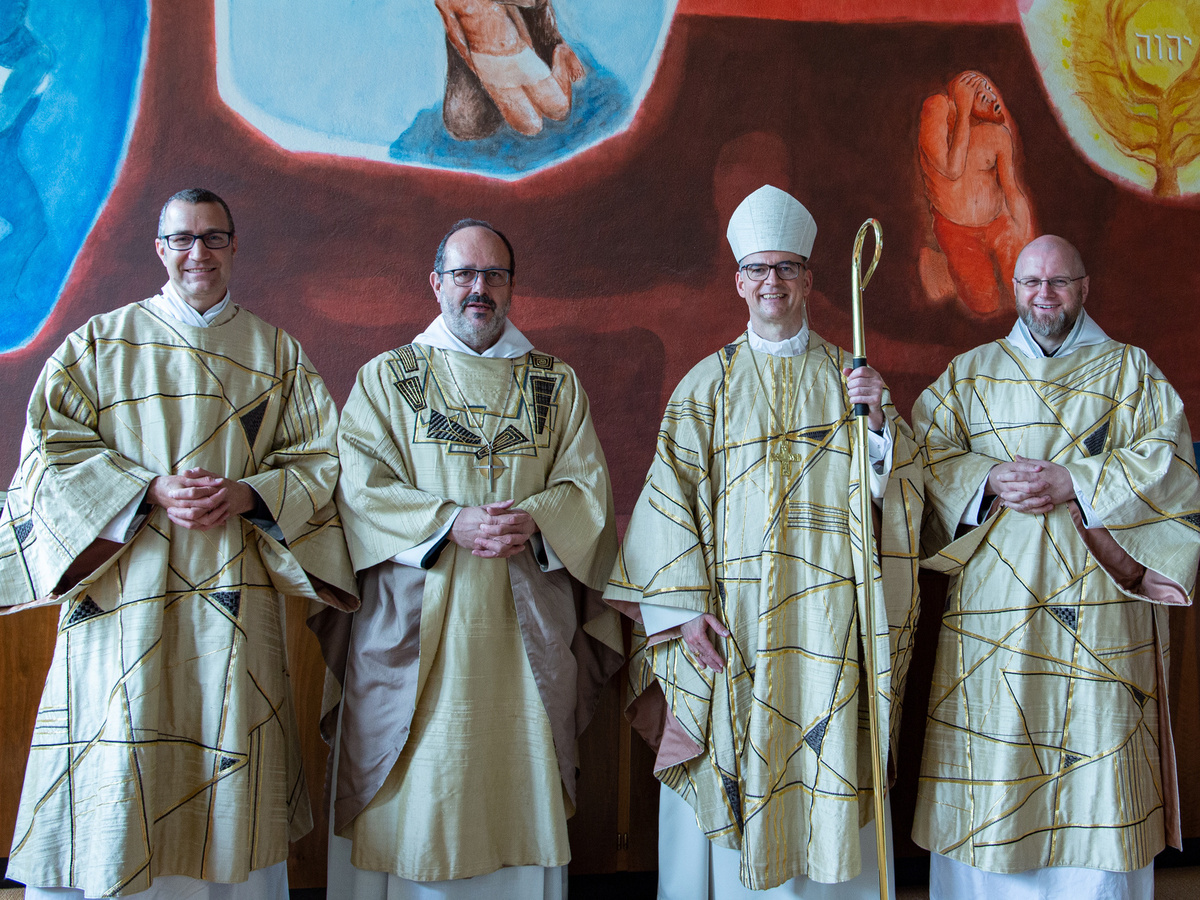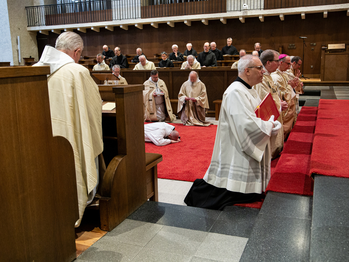 In der Predigt stellte Bischof Jung die Lesungen des Hochfests mit Versen aus der Benediktsregel und Gedanken zum Dienst des Diakons in Beziehung. Christus, erklärte er, verlasse an Himmelfahrt nicht die Kirche. „Christus geht uns voraus zum Vater.“ Sein Gott solle auch der Gott der Menschen werden. Die Mönche versprechen in ihrer Profess die „Conversatio morum“, bei der es jeden Tag aufs Neue darum gehe, das Herz zum Herrn zu erheben. Der Diakon habe durch sein Amt den Auftrag, diese Conversatio nicht nur vorzuleben, sondern durch seinen Dienst zu fördern.