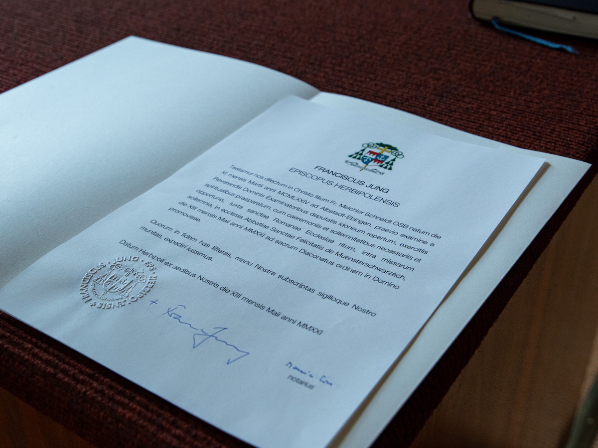 Der Bischof schloss seine Predigt mit einem Zitat aus dem Prolog der Benediktsregel: „Wir wollen also eine Schule für den Dienst des Herrn einrichten.“ Für Schnaidt erbat er am Tag seiner Weihe, dass der Dienst als Diakon „eine solche Schule für den Dienst des Herrn sein möge“ – innerhalb seiner Gemeinschaft und bei allen anderen Menschen.