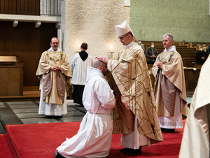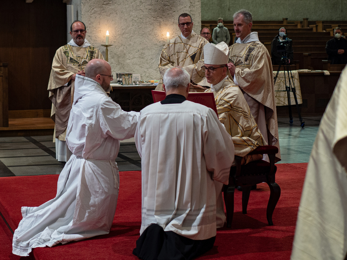 Weiter führte der Bischof aus, dass Christus durch seinen Aufstieg in den Himmel vorher erst herabsteigen musste. Dieses Herab- und Hinaufsteigen finde sich auch in der Benediktsregel im Demutskapitel: „Aufstieg nur durch Abstieg, das ist das paradoxe Grundgesetz des geistlichen Lebens.“ Wer als Diakon dienen wolle, müsse sich also auf einen Weg der inneren Läuterung vorbereiten. „Und wer die Demut gelernt hat, ist zugerüstet für das Dienen und das Amt des Diakons.“