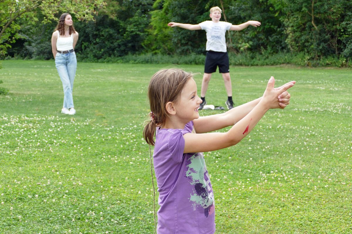 Kinder und Betreuer versuchen, sich von all dem nicht die Laune verderben zu lassen. Von 9 bis 16 Uhr geht das tägliche Programm. „Wir haben Spiele herausgesucht, die man auch mit Abstand spielen kann“, erklärt Bayer. „Ich packe meinen Koffer“ oder das selbst erfundene Westernspiel „Päng“ kann man gut im Kreis auf Abstand spielen. Für die Workshops wurden die Sitzbänke im richtigen Abstand markiert. Die Kinder bekommen ihr Material in Schuhkartons, die sie die Woche über benutzen können. Das Team hat festgestellt, dass die Kinder an viele der Bestimmungen bereits durch die Schule gewöhnt sind. Der elfjährige Noah hat jedenfalls Spaß. „Ich finde die große Fläche und die Spielmöglichkeiten toll und dass man hier neue Freunde kennenlernen kann“, zieht er als Fazit für die Woche. An die Masken, sagt er, hat er sich schon in der Schule gewöhnt. „Ist zwar schon nervig, aber man lebt damit und gewöhnt sich dran.“ Wieder ganz normal mit seinen Freunden umgehen, das vermisst er schon: „Wir machen immer Bodycheck, und das geht halt jetzt nicht.“ Auch wenn vieles nicht geht, Fußballspielen unter Sicherheitsbedingungen ist auf dem Gelände möglich. „Man nimmt den Ball ja nicht in die Hand“, sagt Bayer lachend und ergänzt, dass der Abstand trotzdem eingehalten werden muss. „Das ist insofern gar nicht schlecht, da gibt es schon mal keine Raufereien, wenn man sich nicht berührt.“