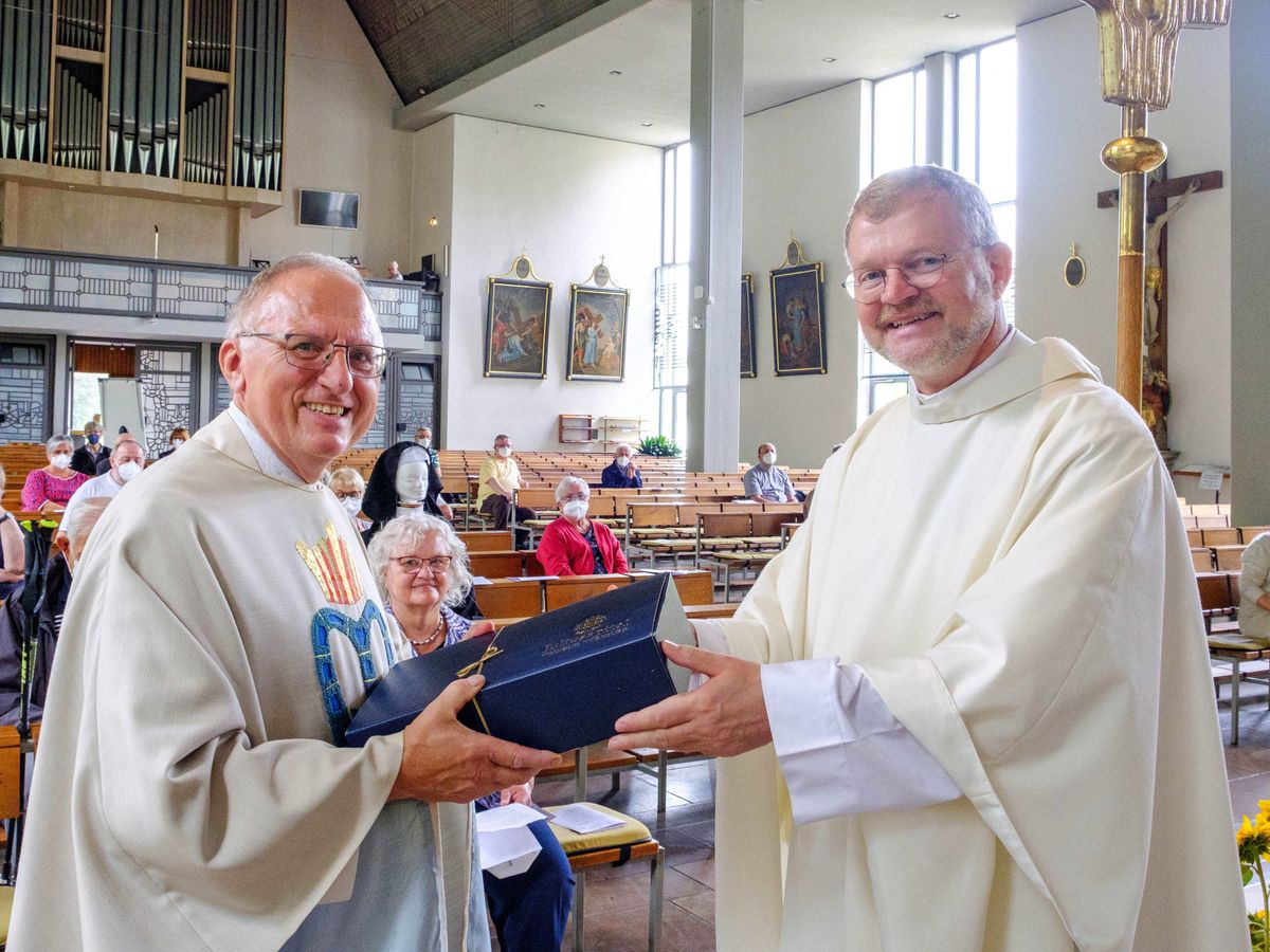 Retzbach/Würzburg (POW) Mit einem Gottesdienst in der Wallfahrtskirche „Maria im grünen Tal“ und einer Feierstunde in der Benediktushöhe – Haus für soziale Bildung in Retzbach ist Pfarrer Franz Schmitt, Leiter der Pfarreiengemeinschaft „Emmaus: Erlach – Frickenhausen – Kaltensondheim – Zeubelried“, Ende Juli offiziell von seiner Aufgabe als Diözesan-Altenseelsorger verabschiedet worden. Schmitt war vom 1. September 2010 bis 1. September 2020 mit halber Stelle als Diözesan-Altenseelsorger beauftragt. Anlass für die Entpflichtung war die Umstrukturierung der Hauptabteilung Seelsorge des Bistums, schreibt das Katholische Senioren-Forum der Diözese Würzburg in einer Pressemitteilung. Aufgrund der Coronapandemie musste die für November 2020 geplante Verabschiedung verschoben werden.