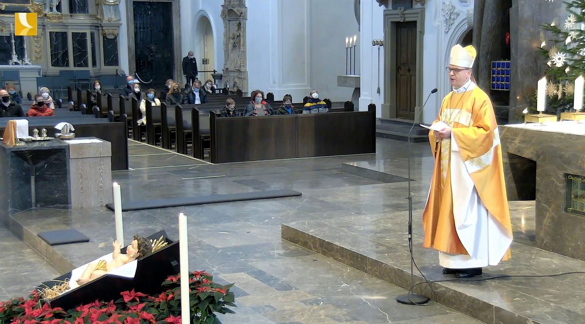In der Christmette erinnerte der Bischof daran, dass sich die Menschen im vergangenen Jahr in eine Vielzahl von Listen eintragen mussten: in Cafés, bei Tagungen oder auch bei Gottesdiensten. Sie dienten dazu, den Weg des Virus nachzuverfolgen. Es seien Listen, in denen es um Leben und Tod gehe. Auch in der Weihnachtsgeschichte gebe es eine Liste. „Jesus wurde mit seinen Eltern in menschlichen Listen eingetragen. Der unfassbare Gott muss es dulden, auch auf Listen geführt zu werden wie die Sterblichen zu allen Zeiten, auch jetzt in Coronazeiten.“