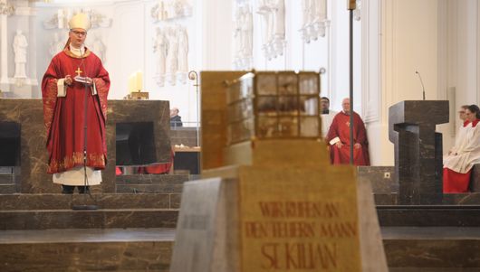 In seiner Predigt nahm der Bischof Bezug auf ein Wort aus dem Epheserbrief, das er für das Bistum Würzburg als Jahresmotto ausgewählt hat. Darin spricht Paulus davon, „die Länge und Breite, die Höhe und Tiefe“ der Liebe Christi zu ermessen. „Jede Zeit und jede Generation ist aufgerufen, diesen geistlichen Raum und diese geistliche Geographie neu auszuloten.“ Das gelte insbesondere für das laufende Jahr, in dem die Pastoralen Räume im Bistum festgelegt werden sollen, aber auch für die folgenden Jahre, in denen diese Räume mit Leben gefüllt werden müssen. Die Frankenapostel seien hilfreiche Wegbegleiter. „Sie brachen aus Irland auf, getrieben von der Sehnsucht, der Liebe Christi Raum zu geben“, sagte Bischof Jung.