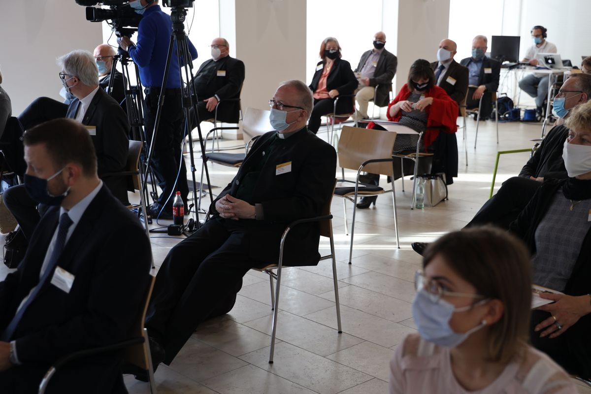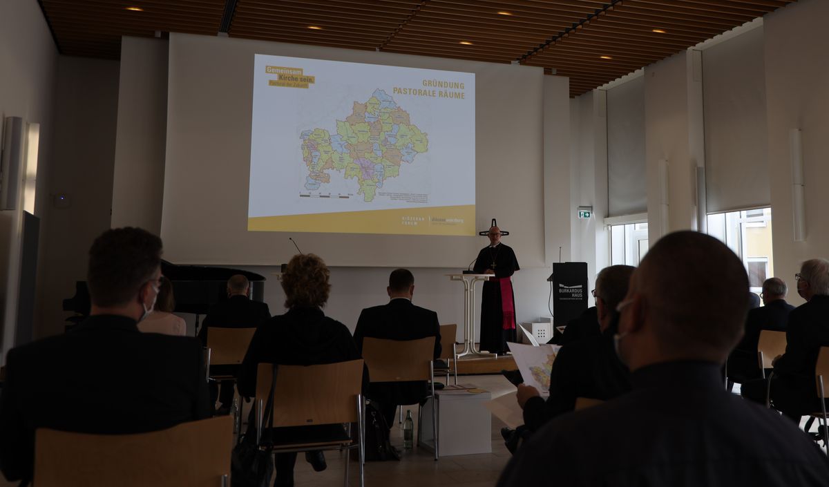 Würzburg (POW) In 40 Pastoralen Räumen wird sich in Zukunft die Seelsorge für die rund 720.000 Katholiken im Bistum Würzburg organisieren. Bischof Dr. Franz Jung hat die Einheiten am Samstag, 24. Oktober, bei einem Diözesanforum im Würzburger Burkardushaus vor rund 50 Vertreterinnen und Vertretern kirchlicher Gremien vorgestellt und Gottes Segen für den weiteren Verlauf des Programms „Gemeinsam Kirche sein – Pastoral der Zukunft“ erbeten. Die Veranstaltung am Fest der Domkirchweihe bezeichnete Generalvikar Domdekan Dr. Jürgen Vorndran als „Richtfest“ der Pastoral der Zukunft. Bis dahin sei es eine Herkulesarbeit gewesen, an der viele auf den unterschiedlichen Ebenen beteiligt gewesen seien. Das gesamte Forum wurde live ins Internet übertragen.