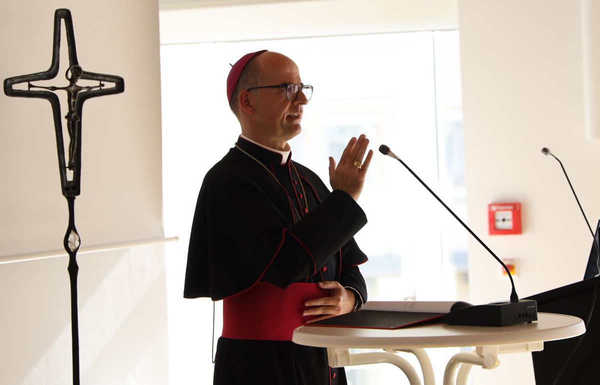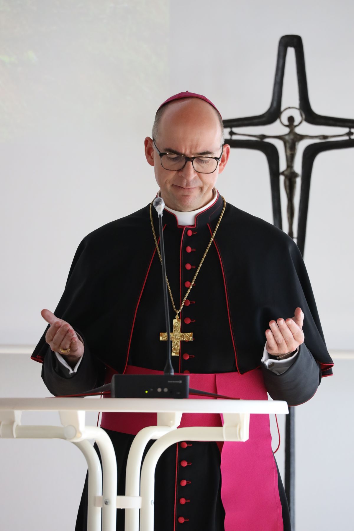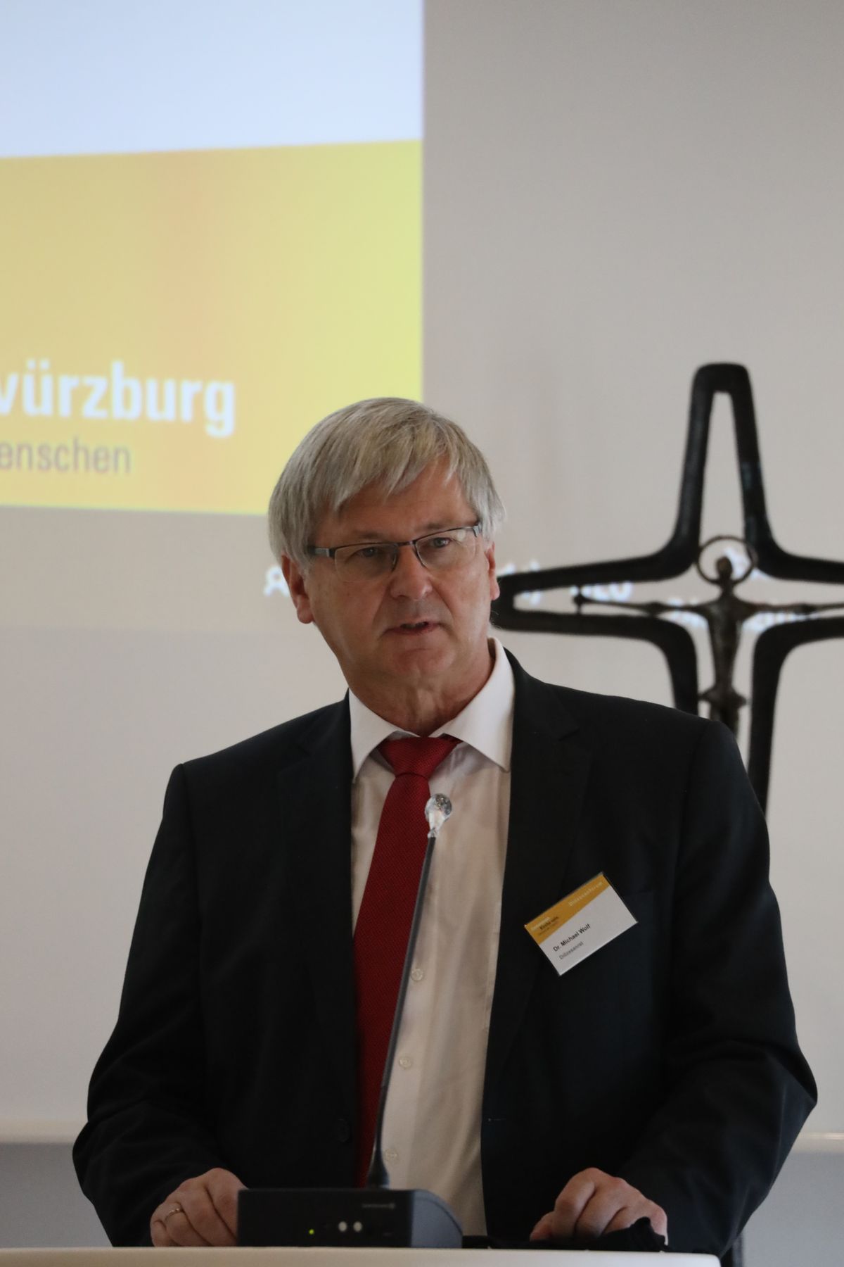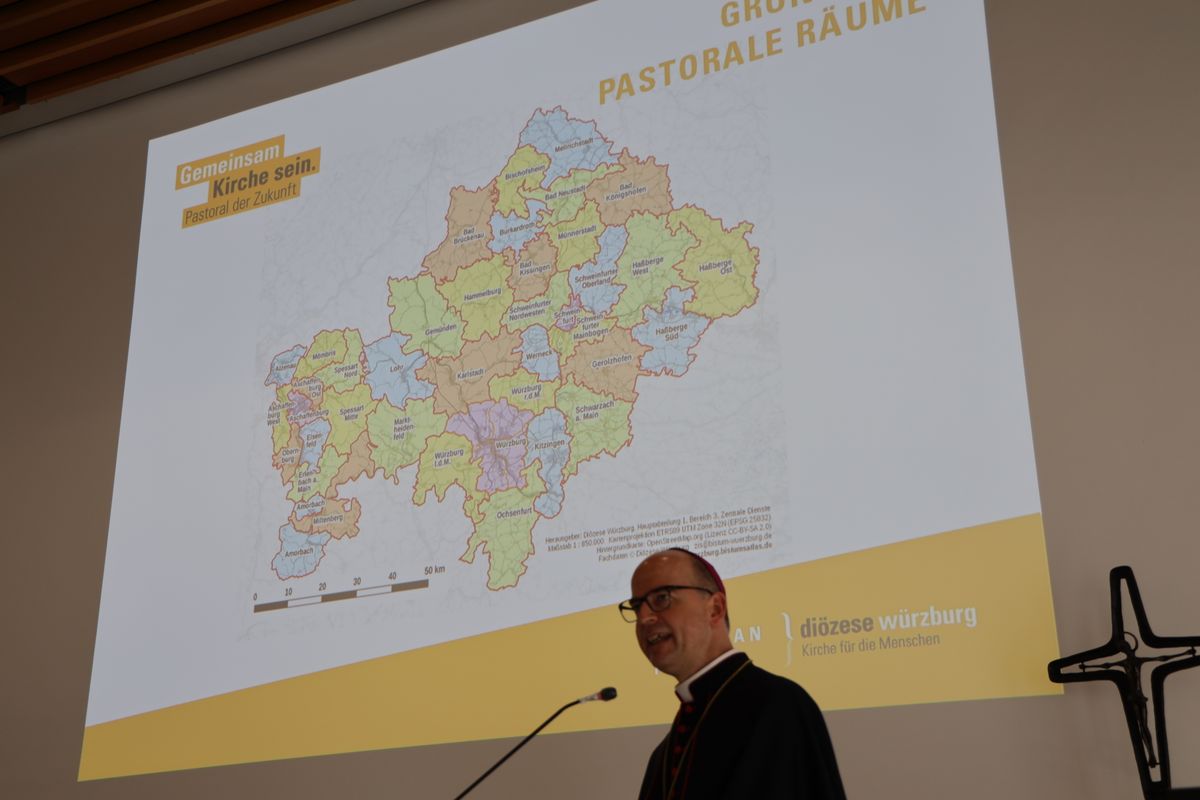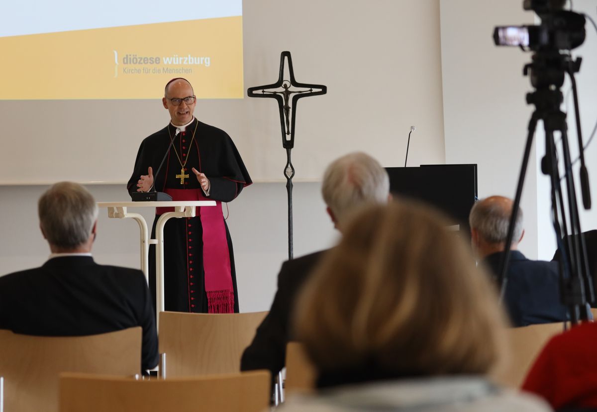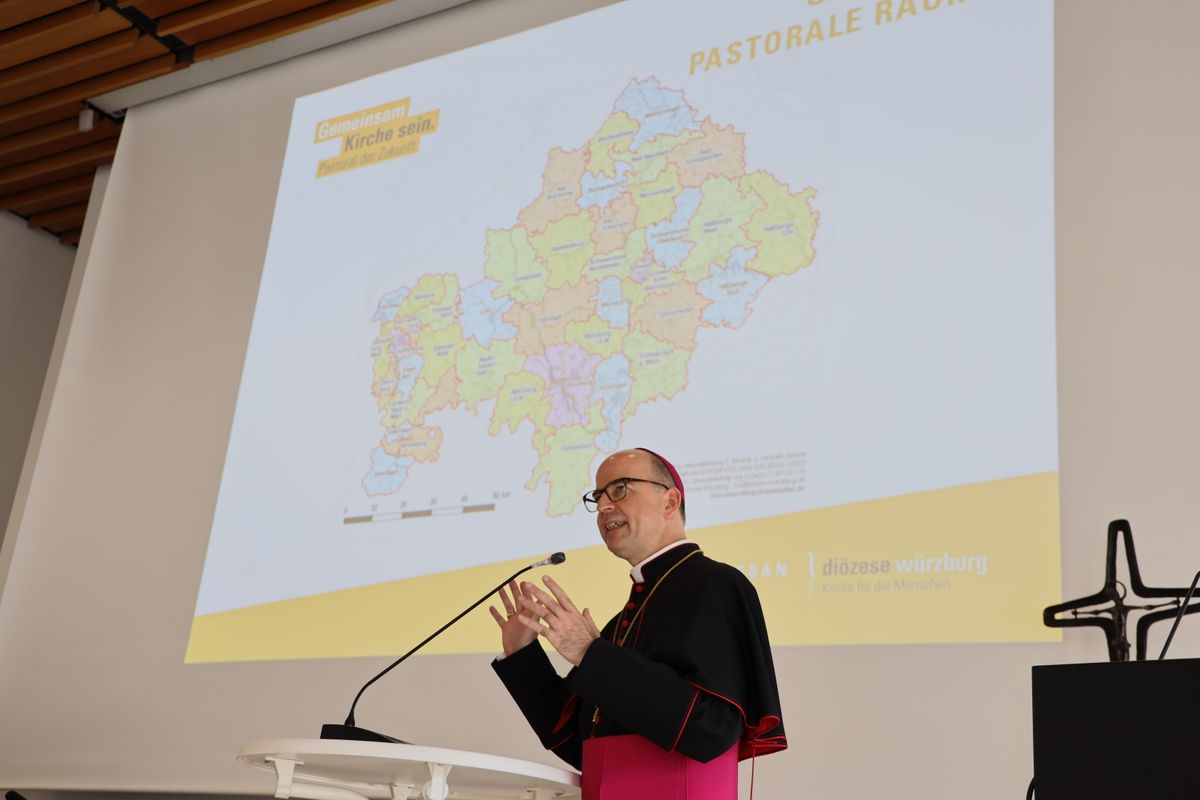 Großpfarreien werde es in der Diözese Würzburg nicht geben, hob der Bischof hervor. Die etwa 600 Pfarreien des Bistums, die mehrheitlich in etwa 160 Pfarreiengemeinschaften zusammengefasst sind, bleiben bestehen. Bis 2025 sollen die Pastoralen Räume erprobt, überprüft und gegebenenfalls optimiert werden. Kirche dürfe nicht nur um sich selbst kreisen, betonte der Bischof. Das bedeute auch, mit den Menschen in den jeweiligen Lebensräumen in die Abgründe des Lebens hinabzusteigen und sich dort infrage stellen zu lassen. „Das heißt auch immer wieder, mit Christus die eigene Ohnmacht aushalten zu lernen, damit wir erkennen, dass Gott das Heil schenkt – und nicht wir selbst.“ Der wiederkehrende Christus im Würzburger Dom mache deutlich, dass Gott den Menschen entgegenkomme und sie auffordere, nie stehen zu bleiben. Der Bischof mahnte in diesem Zusammenhang eine stärkere Zusammenarbeit von Caritas und Pastoral an.