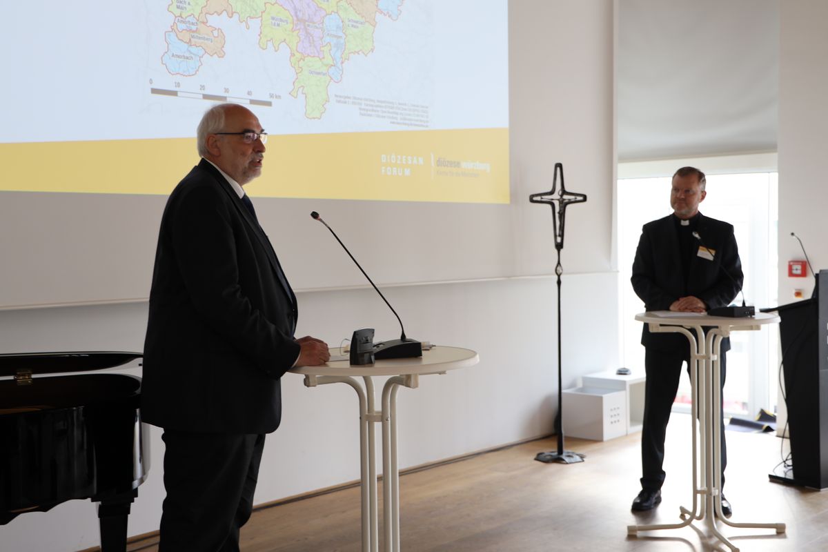 Domkapitular Christoph Warmuth von der Hauptabteilung Seelsorge und Programmverantwortlicher erklärte, bis 2022 seien die Pastoralen Räume aufgefordert, in der sogenannten Gestaltungsphase ein pastorales Konzept für ihren Bereich zu umschreiben und Formen der verbindlichen Zusammenarbeit zu etablieren. Ende 2022 werde dann bei einem weiteren Diözesanforum ein Zwischenfazit gezogen, die Implementierungsphase dauere dann bis Ende 2025. Für die Teambildung in den Pastoralen Räumen, aber auch für die Gemeinden und Pfarreiengemeinschaften, die Hilfe beim Einfinden in die neuen Pastoralen Räume brauchen, gibt es begleitende Angebote von Gemeindeberatung, dem Fortbildungsinstitut (fbi) sowie von Supervision und Coaching, die alle in der Hauptabteilung „Bildung und Kultur“ angesiedelt sind. Noch offen ist unter anderem, wie künftig eine mittlere Ebene – die bisherigen Dekanate – zugeschnitten sein und welche Aufgabe sie haben wird. „Das wird auch bei der Wahl eines Laiengremiums auf dieser Ebene und der Satzung hierfür zu berücksichtigen sein“, erklärte Diözesanratsvorsitzender Dr. Michael Wolf.