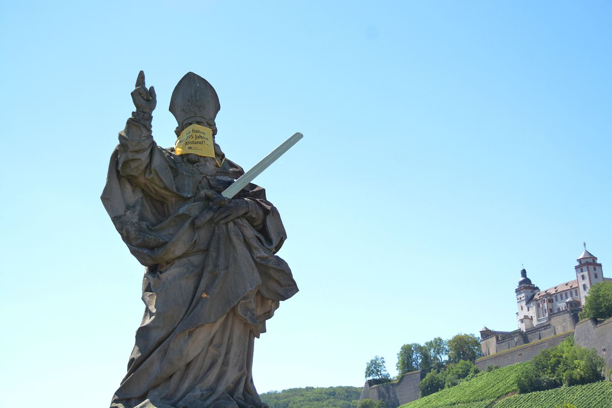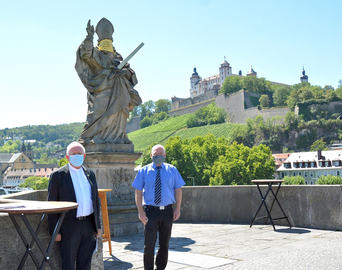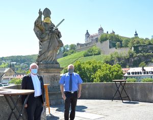 „Vielleicht helfen uns die Brückenheiligen, jetzt mit Abstand achtsam zu sein und den Nächsten zu schützen“, sagte der Weihbischof bei einem Pressegespräch am Freitag, 31. Juli, im Rathaus. Der Weihbischof habe dazu ermutigt, die Solidarität in der Gesellschaft weiter zu stärken und auch in Zukunft über alle Generationen hinweg zu erhalten, schreibt die Stadt in einer Pressemitteilung. Um den Appell auch nach außen sichtbar zu machen, trugen die Brückenheiligen auf der Alten Mainbrücke am Freitagvormittag Mund-Nasen-Masken. „Wir alle sind bislang durch konsequentes Handeln und umsichtiges Verhalten sehr gut durch die Corona-Krise gekommen. Jetzt dürfen wir die in Teilen wiedergewonnene Normalität nicht aufs Spiel setzen“, appellierte Oberbürgermeister Christian Schuchardt. „Unsere Infektionszahlen steigen derzeit zwar nur gering. Doch dies ist leider kein Grund zum Zurücklehnen – es kann sich sehr schnell ändern“, sagte Dr. Johann Loew, Leiter des Gesundheitsamtes für Stadt und Landkreis Würzburg. Nur gemeinsam könne es gelingen, die Ausbreitung des Coronavirus in den Griff zu bekommen, ergänzte Professor Dr. Georg Ertl, Ärztlicher Direktor des Universitätsklinikums Würzburg. Kommunalreferent Wolfgang Kleiner appellierte an alle, die Pandemie trotz aller Lockerungen nicht auf die leichte Schulter zu nehmen. „Achten wir aufeinander, gehen wir mit Vorsicht und Umsicht miteinander um, genießen den Sommer, aber halten auch Abstands- und Hygieneregeln ein und tragen, so unbequem sie sind, unsere Alltagsmasken.“