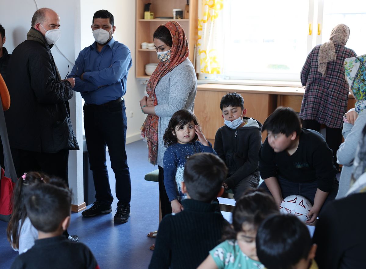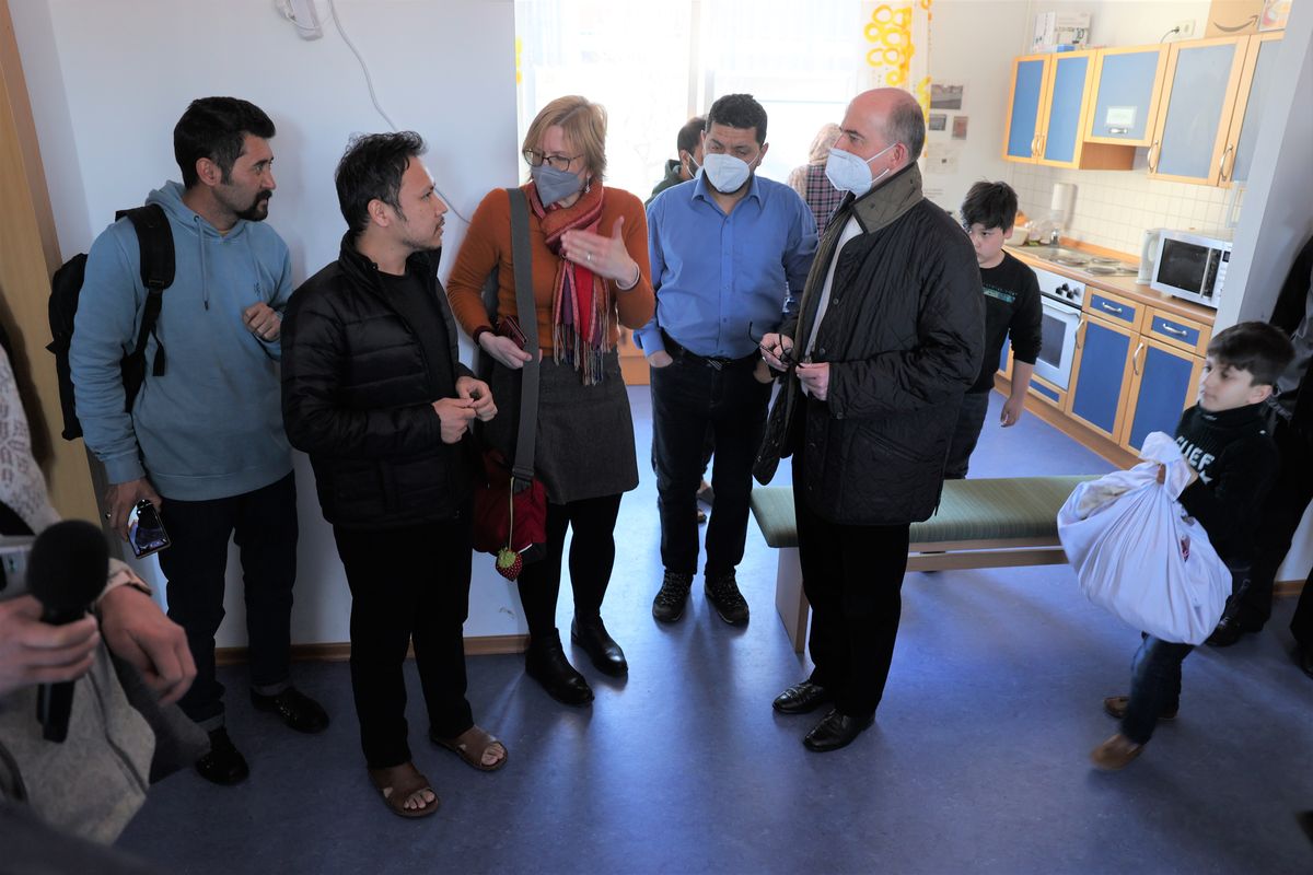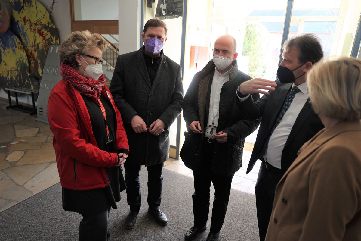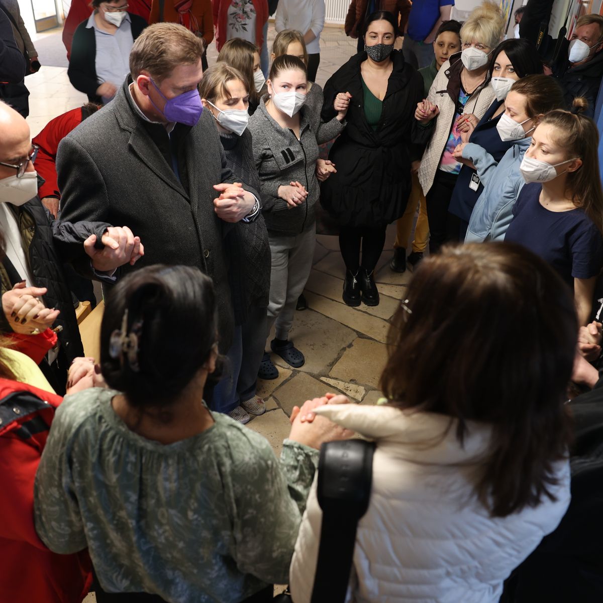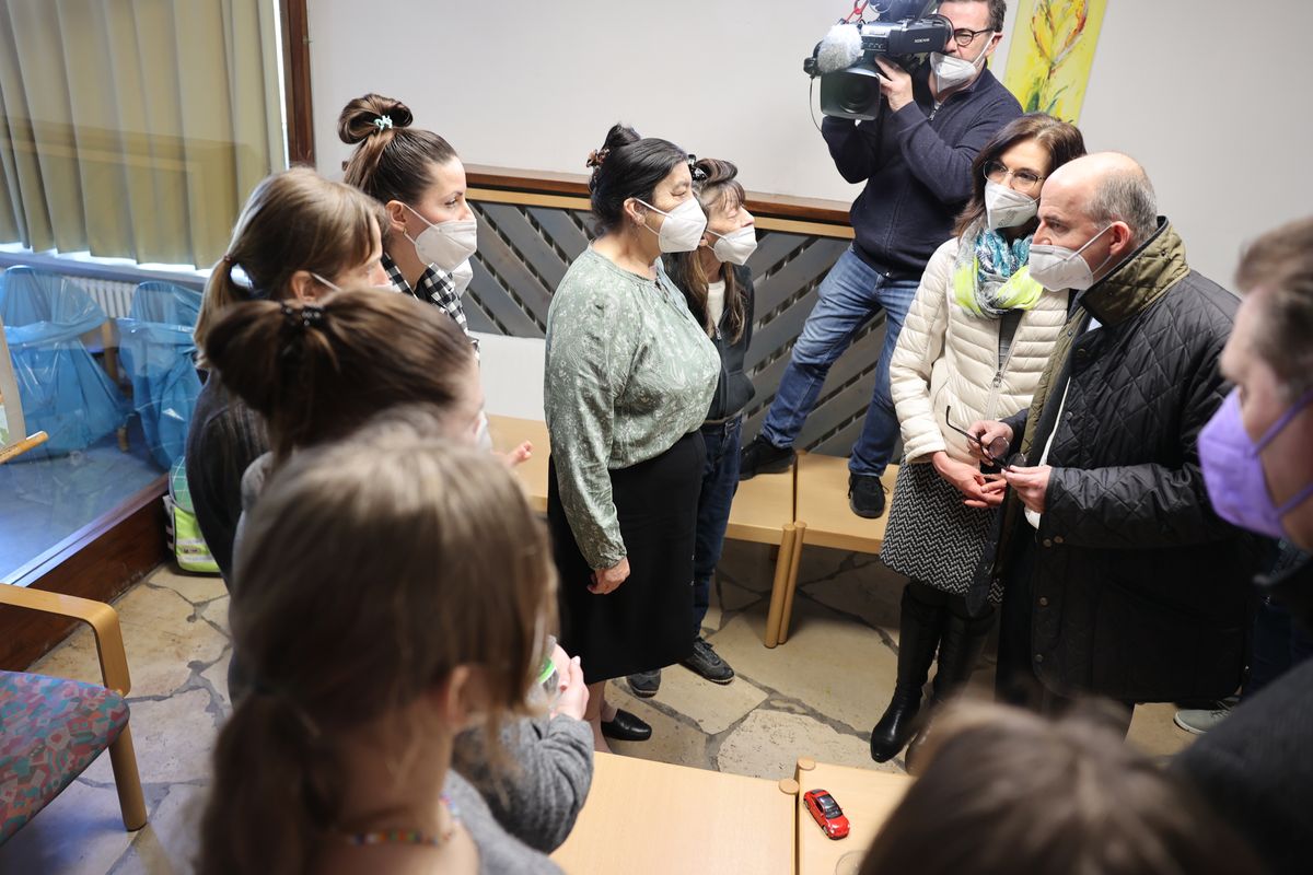 Bad Königshofen (POW) Schilderungen des Leids und große Dankbarkeit: Beides hat Bischof Dr. Franz Jung am Freitag, 11. März, bei einer Begegnung im Haus Sankt Michael mit Geflüchteten aus der Ukraine erfahren. Rund 40 Frauen und Kinder aus den Kriegsgebieten sind dort seit Dienstagabend untergebracht. Der Bischof suchte das Gespräch mit den Geflüchteten und betete zum Abschluss gemeinsam mit ihnen. Auch den knapp 40 afghanischen Ortskräften, die schon länger im Selbstversorgertrakt des Hauses Sankt Michael untergebracht sind, stattete der Bischof einen Besuch ab. Das Bistum stellt für Geflüchtete aus der Ukraine das Jugendhaus Thüringer Hütte und das Haus Sankt Michael kostenfrei zur Verfügung. Lediglich die Nebenkosten wie Strom, Heizung und Wasser übernimmt das örtliche Landratsamt.