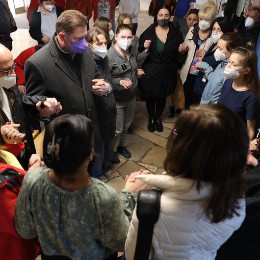 Bischof Jung dankte allen, die sich um die Geflüchteten kümmern. Den Ukrainerinnen und ihren Familien wünschte er weiterhin Tapferkeit und Gottes Segen. Gemeinsam betete er mit ihnen mit dem Anliegen eines baldigen Friedens das Vaterunser.