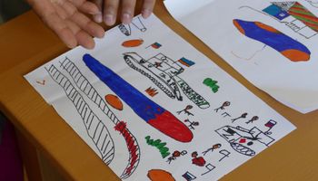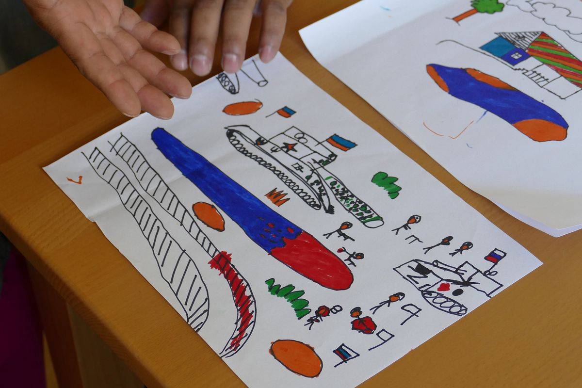 Wenn Nawsaz erklären will, was seine Familie erlebt hat, dann zeigt er ein Bild, das sein achtjähriger Sohn Arian nach der Ankunft in Miltenberg gemalt hat. Man sieht darauf Panzer, die ukrainische und die russische Flagge und tote Soldaten, die in ihrem Blut liegen. Bei Kriegsbeginn am 24. Februar seien sie vom Lärm der Bomben geweckt worden, erzählt er. Die Kinder hätten in den Bombenpausen immer wieder gefragt, ob der Krieg denn jetzt vorbei sei. Aber das war er natürlich nicht und wird es wohl auch lange nicht sein.